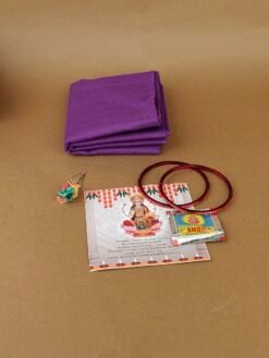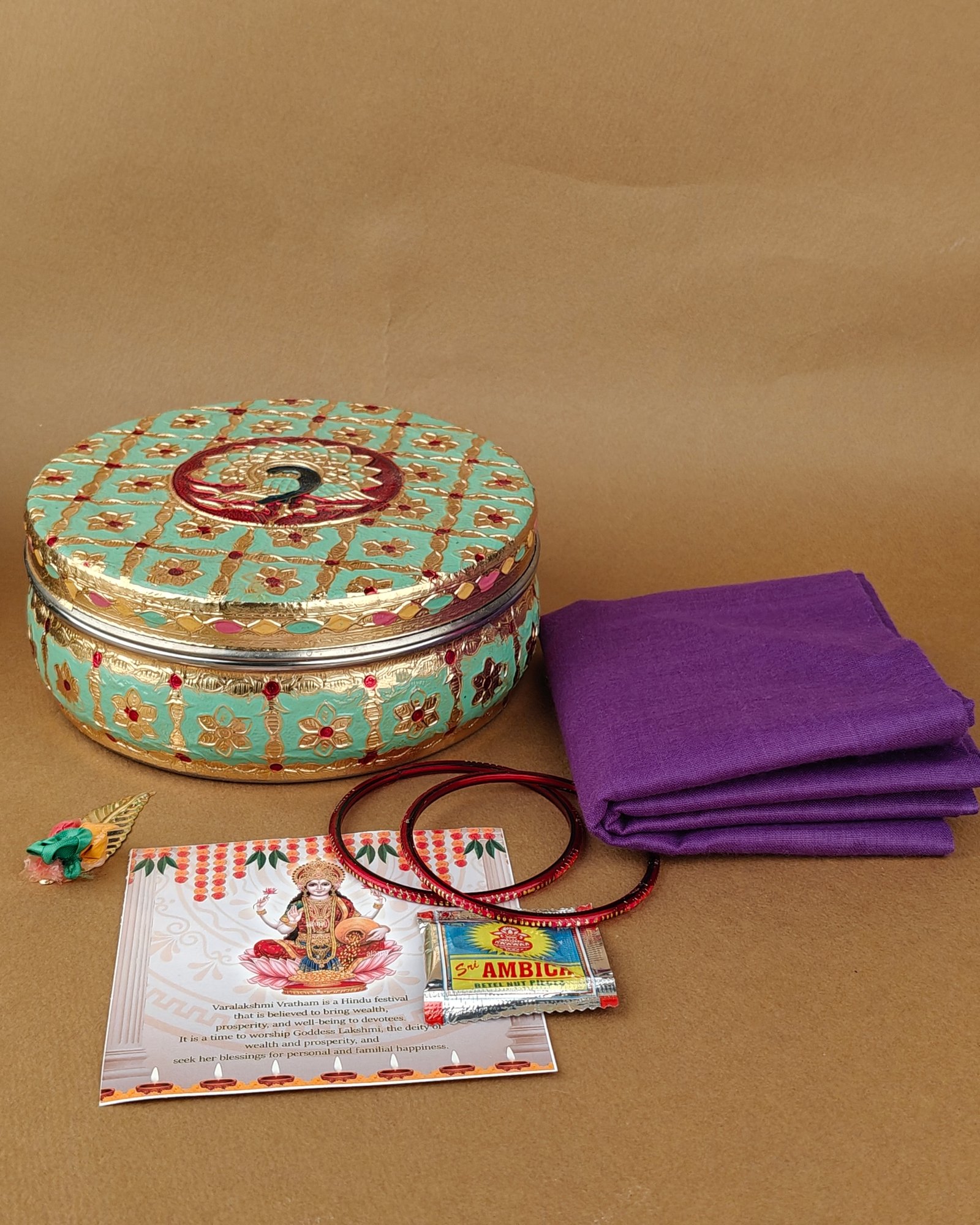 A colorful and artistic hamper featuring a handcrafted Meenakari box. Perfect for storing kumkum, jewellery, or pooja items. Beautifully curated as a premium gift option. Adds vibrant charm to festive occasions.