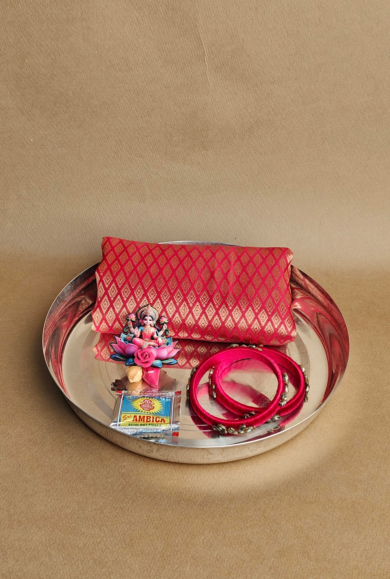 A beautifully crafted 8-inch German silver plate filled with thoughtfully selected festive goodies. Its traditional design and polished finish make it suitable for gifting and celebrations. Ideal for pooja offerings, return gifts, or festive hampers. A timeless addition to any collection.
