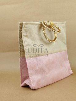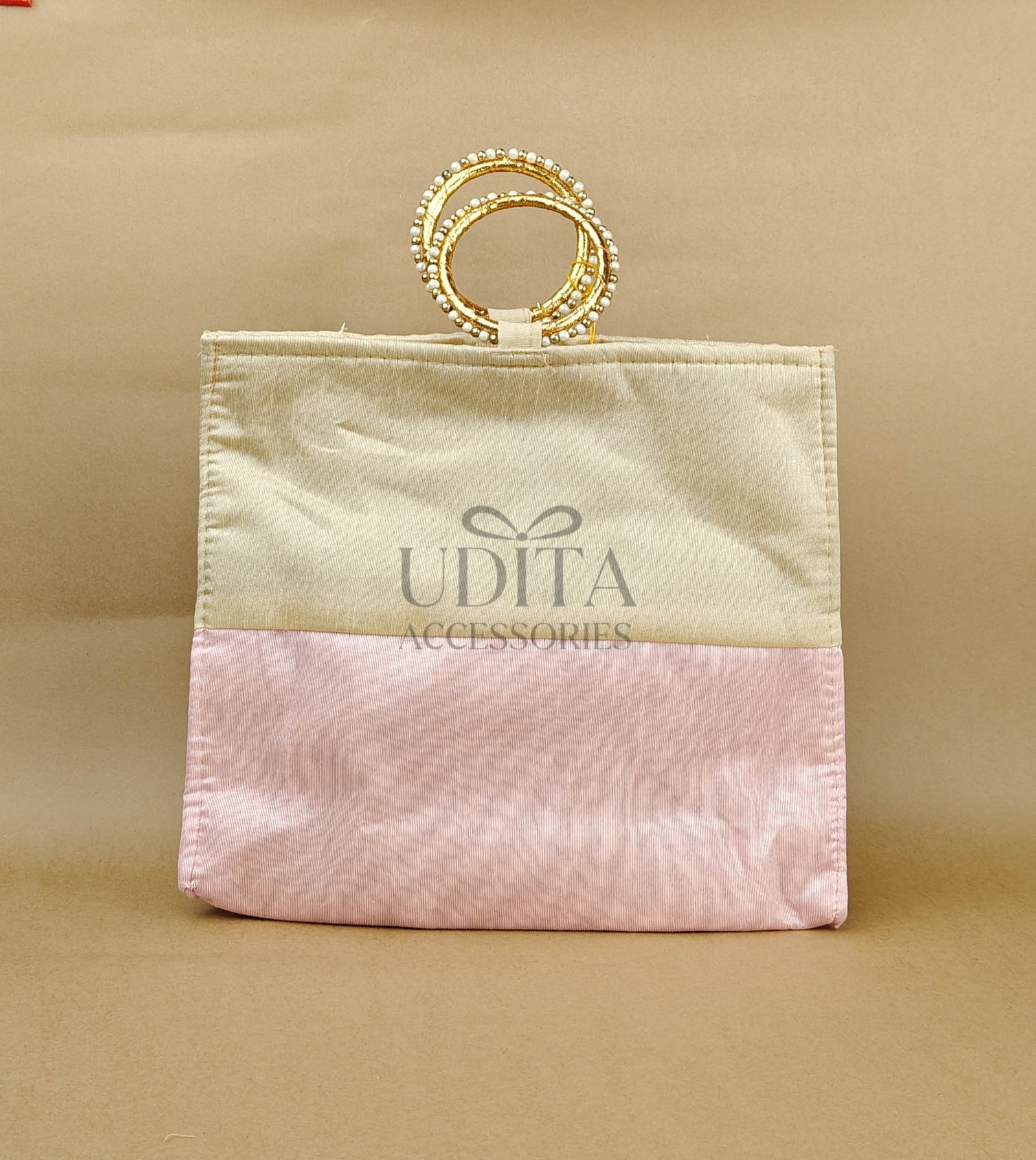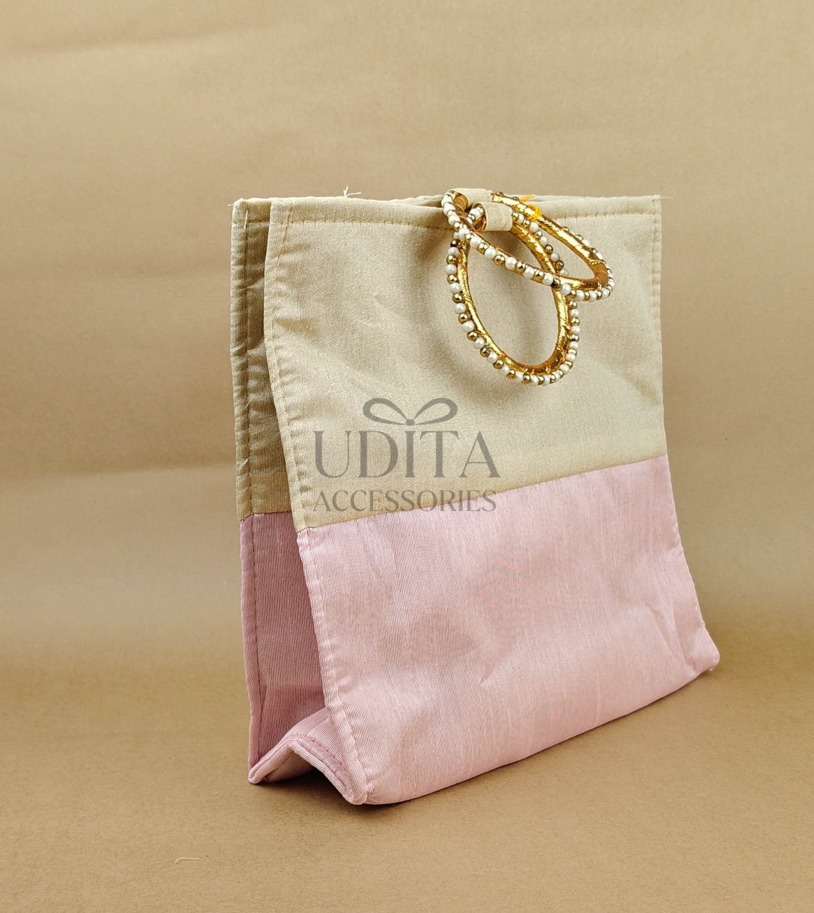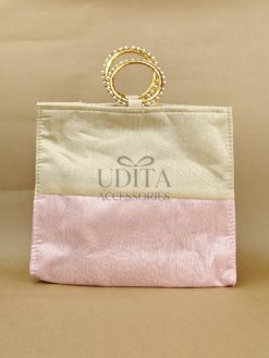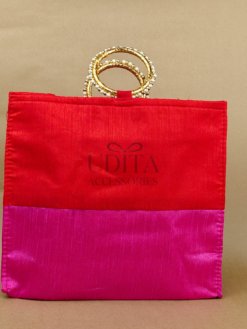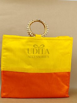 A colorful bag decorated with traditional patch work and bangle-style handles. Perfect for festive gifting and return gifts. Lightweight and eye-catching. Adds a cultural charm to your attire.