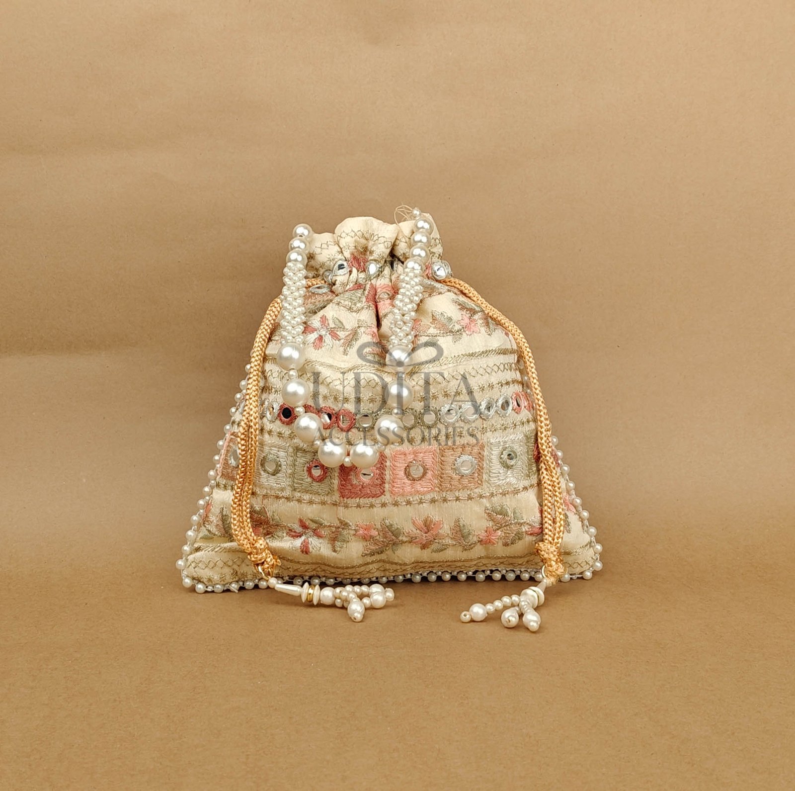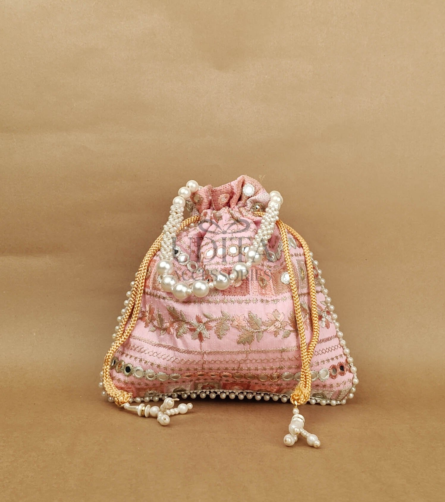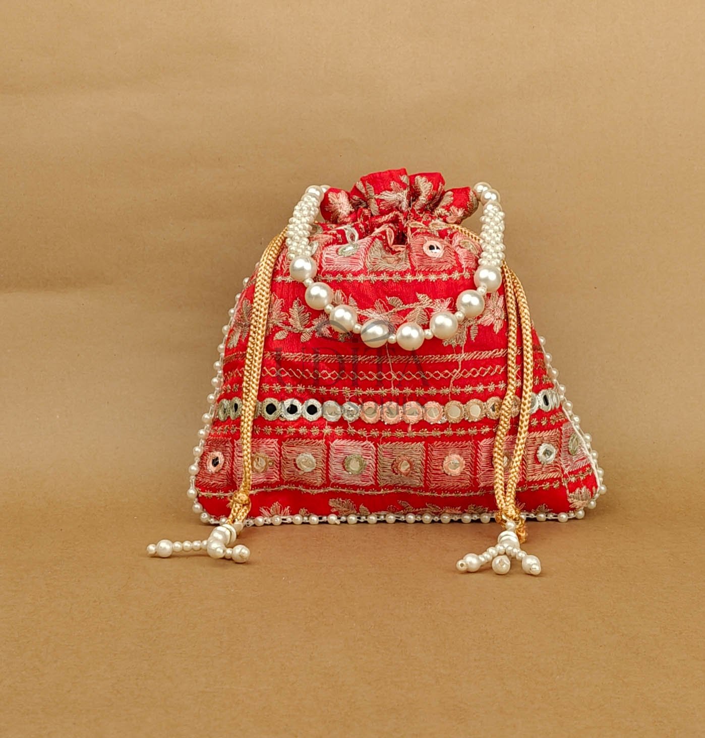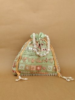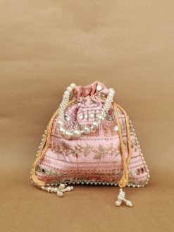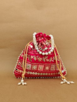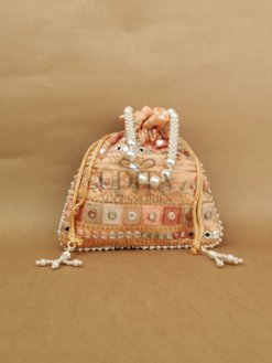A premium potli embellished with large pearls for a grand festive look. Perfect for weddings, haldi-ceremony gifting, or party wear. Spacious and elegant. A trending accessory loved for its luxe finish.