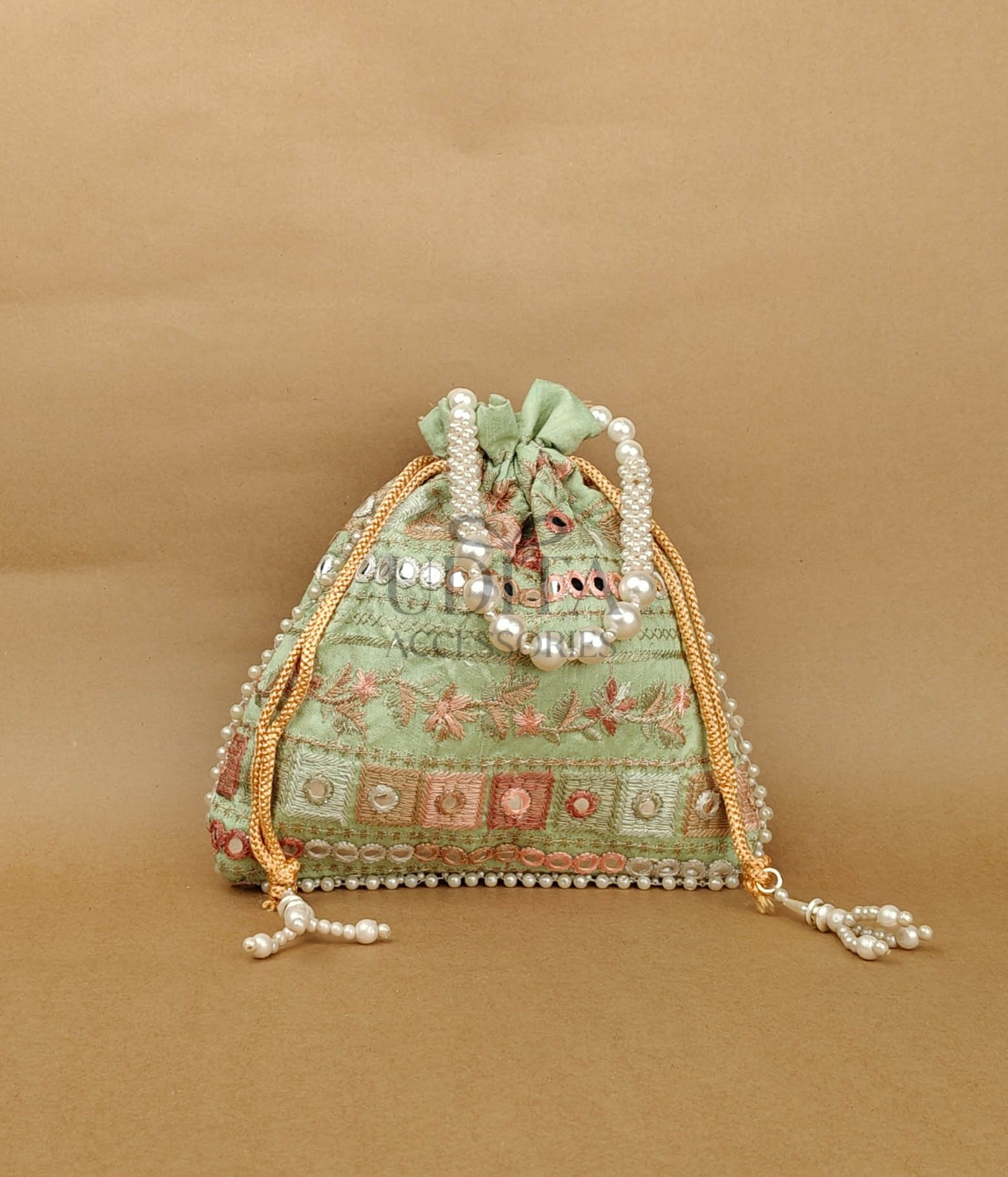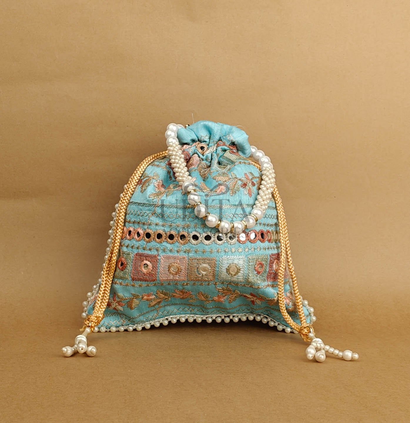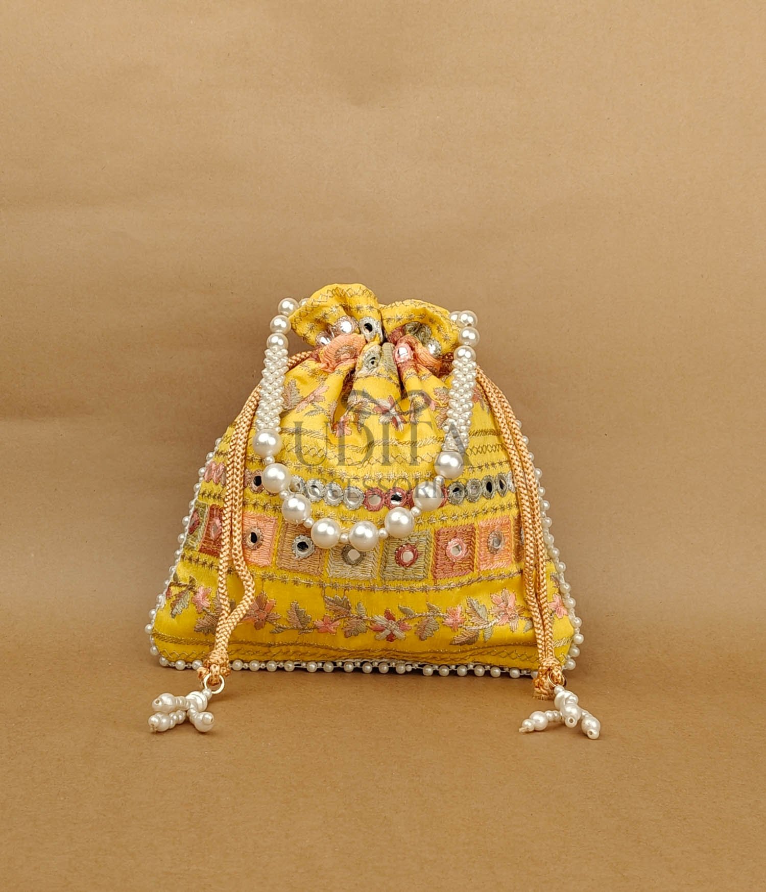 A premium potli embellished with large pearls for a grand festive look. Perfect for weddings, haldi-ceremony gifting, or party wear. Spacious and elegant. A trending accessory loved for its luxe finish.