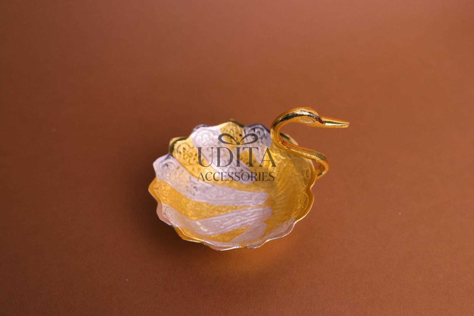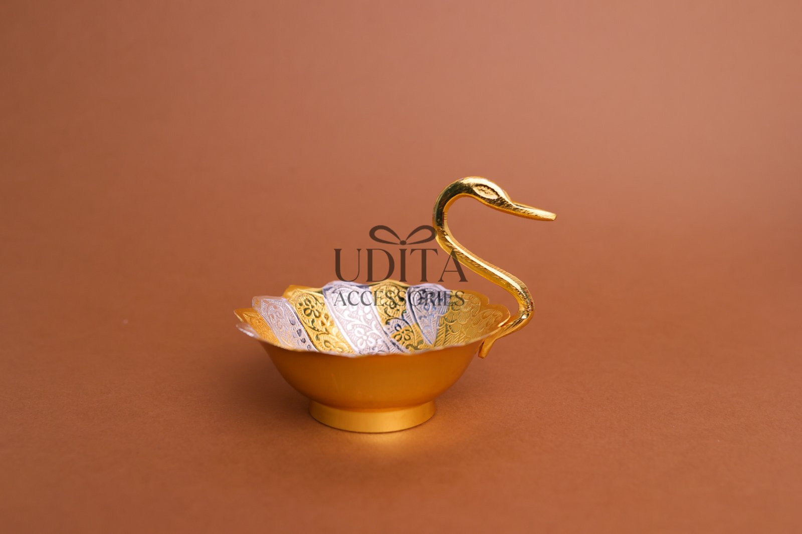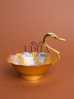 An elegant swan-shaped brass bowl presented in a luxurious velvet box.Perfect for serving dry fruits, chocolates, or using as d?cor. Hand-polished brass adds a royal touch to your living space. Makes an impressive gift for weddings, anniversaries, and festivals.