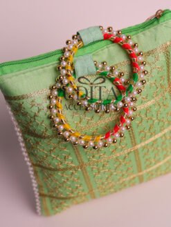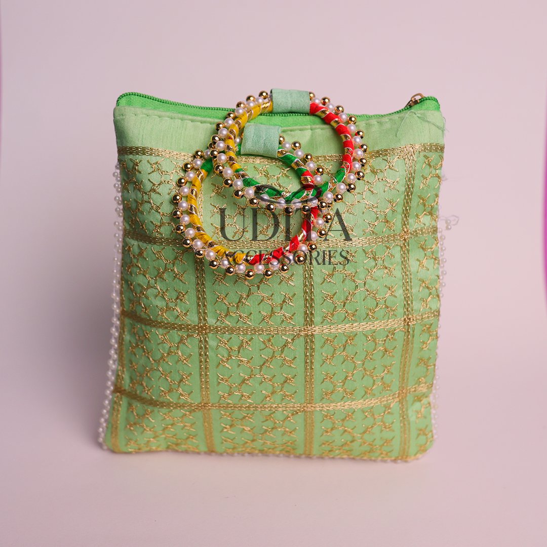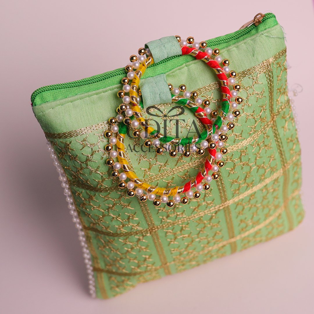 Traditional bangle pouch with beautiful embroidery work.Protects bangles while adding a festive touch.Lightweight and easy to carry.Perfect for gifting and wedding favors.