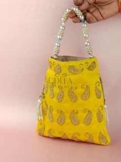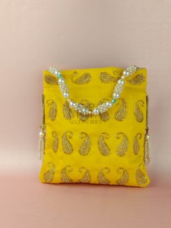 A premium potli featuring golden embroidery and a bold pearl embellishment. Ideal for bridal gifting and festive use. Spacious enough for small essentials. Elegant and eye-catching.