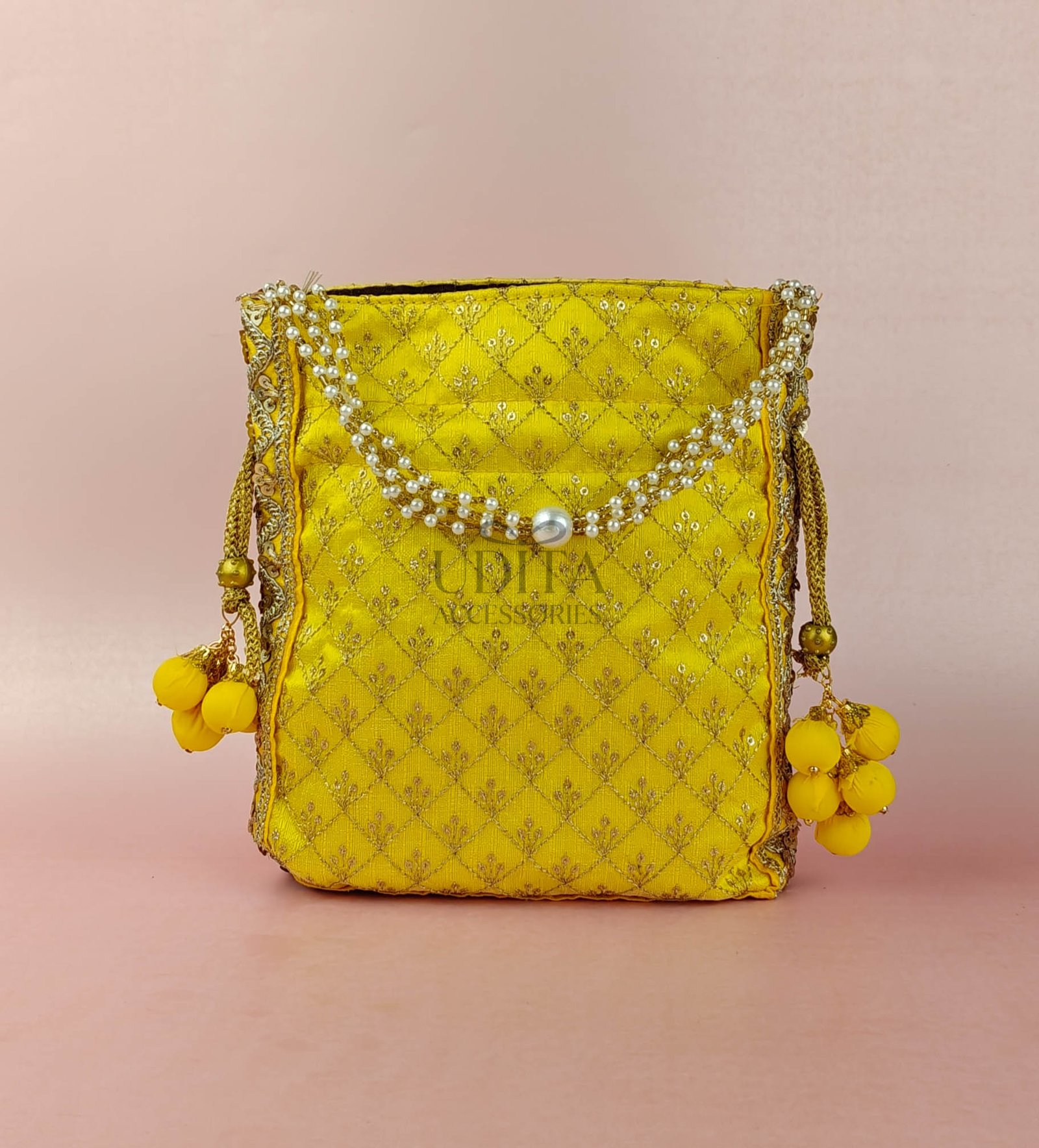 A festive potli decorated with delicate embroidery and tiny pearls. Perfect for weddings, return gifts, and traditional functions. Compact yet elegant. Adds a rich ethnic touch.