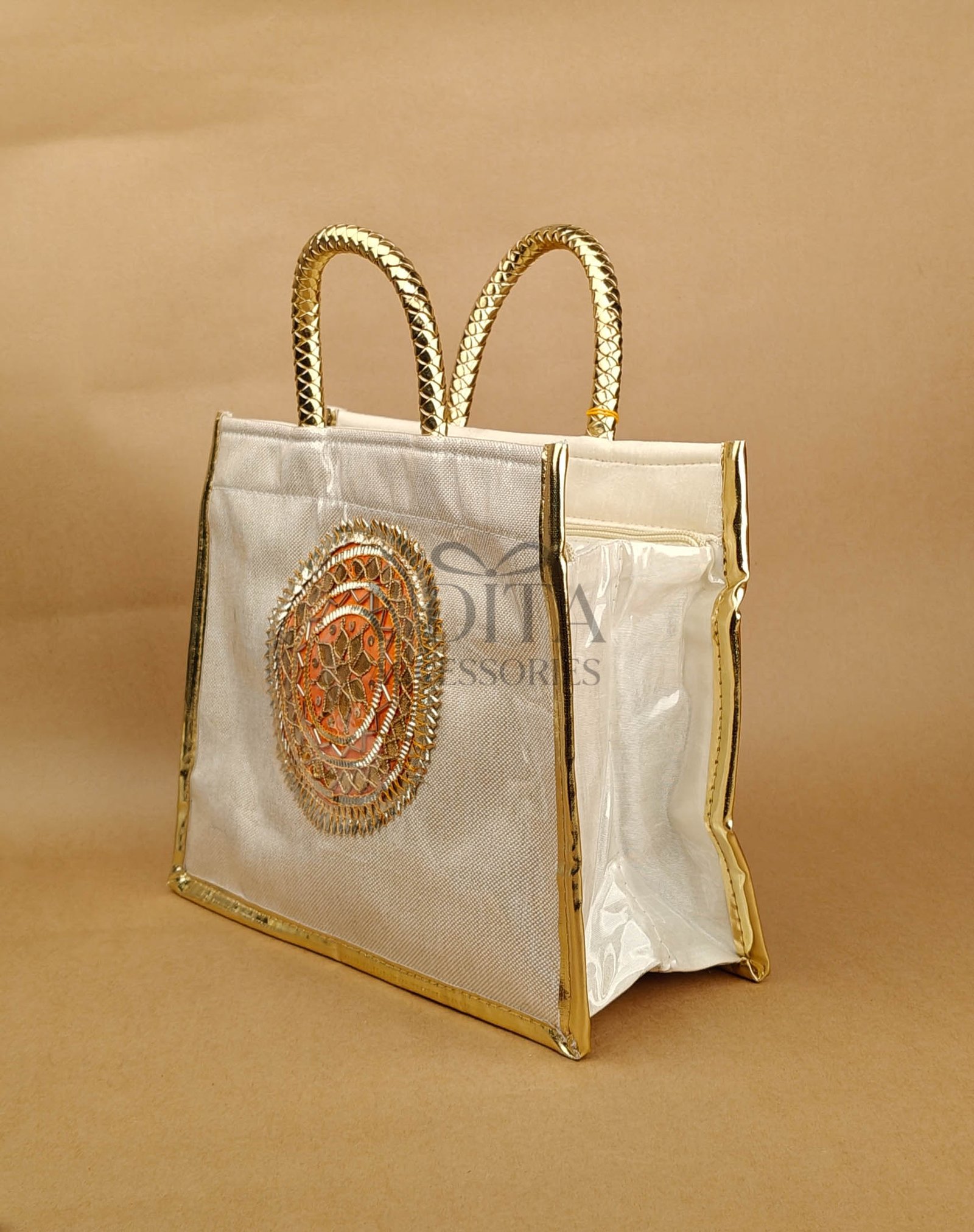 A stylish golden handle bag designed for elegant outings. Lightweight yet classy with premium material. Suits festive, party, and traditional looks. Spacious enough for essentials.