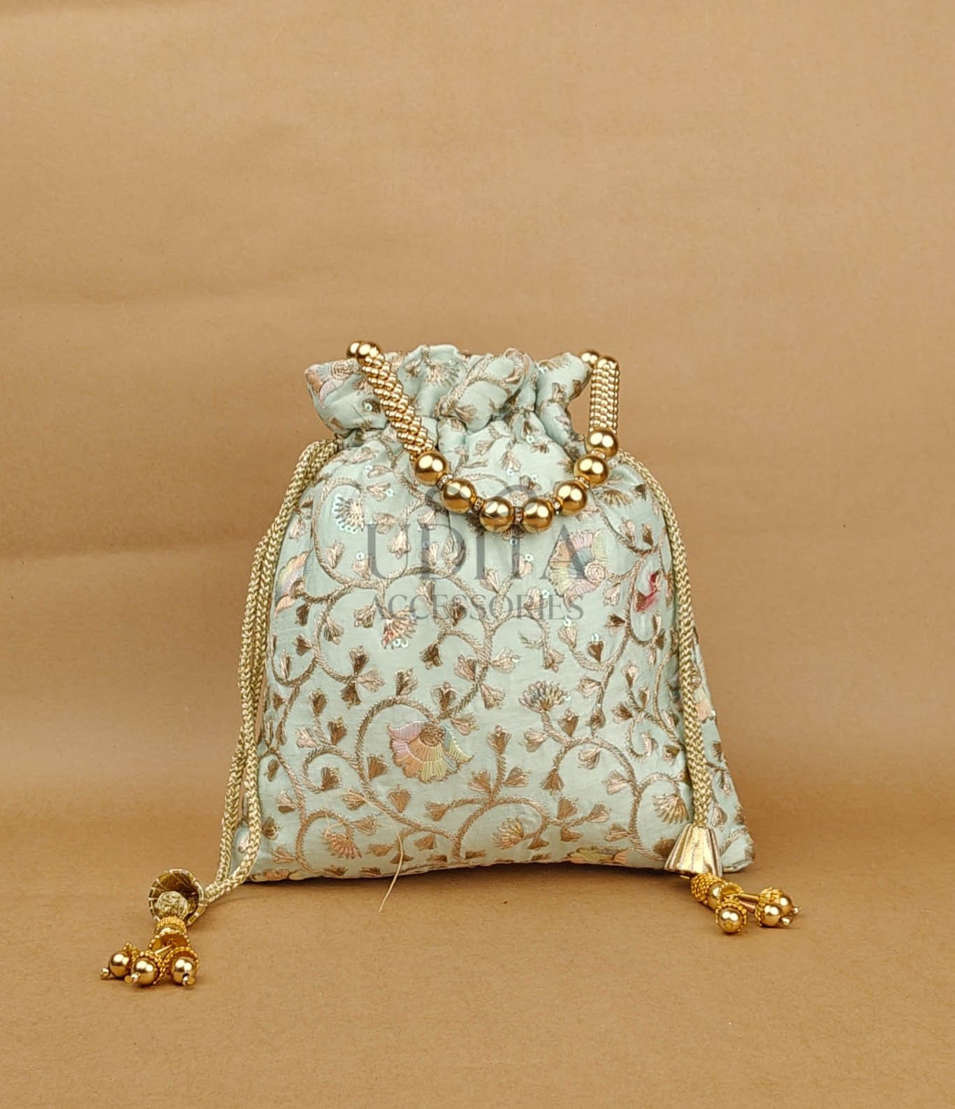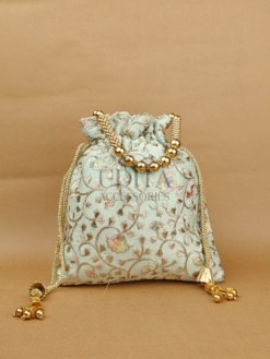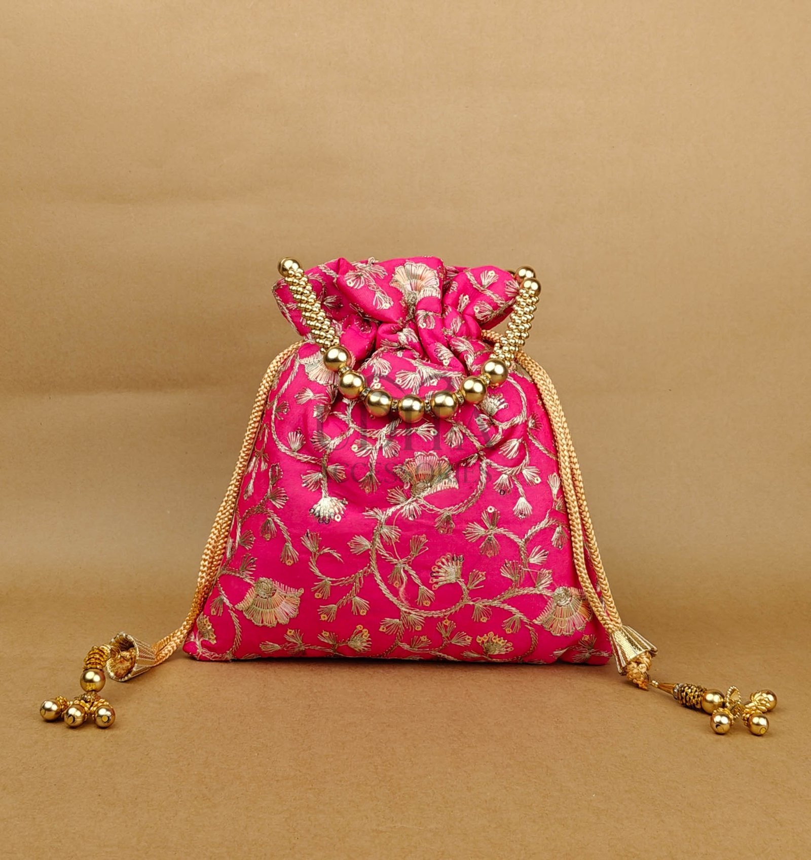 A rich and festive potli bag featuring a metallic golden handle. Intricately designed to complement ethnic wear. Perfect for gifting and festive occasions. Adds a luxurious appeal.