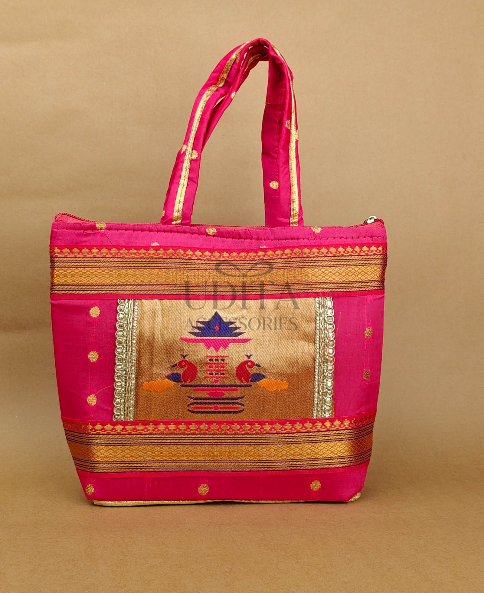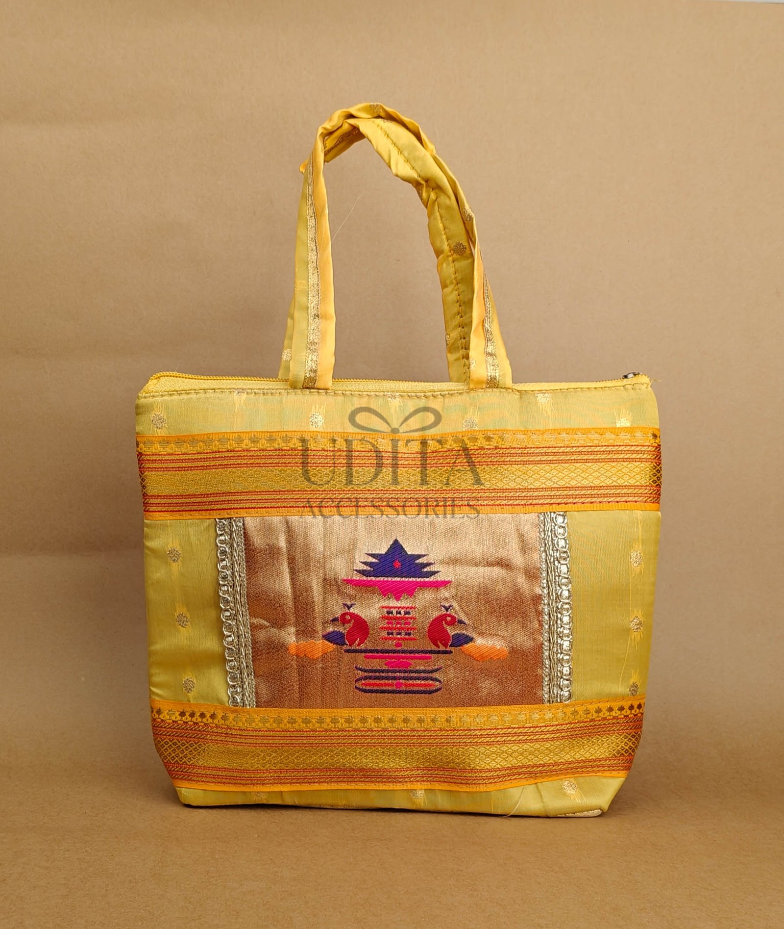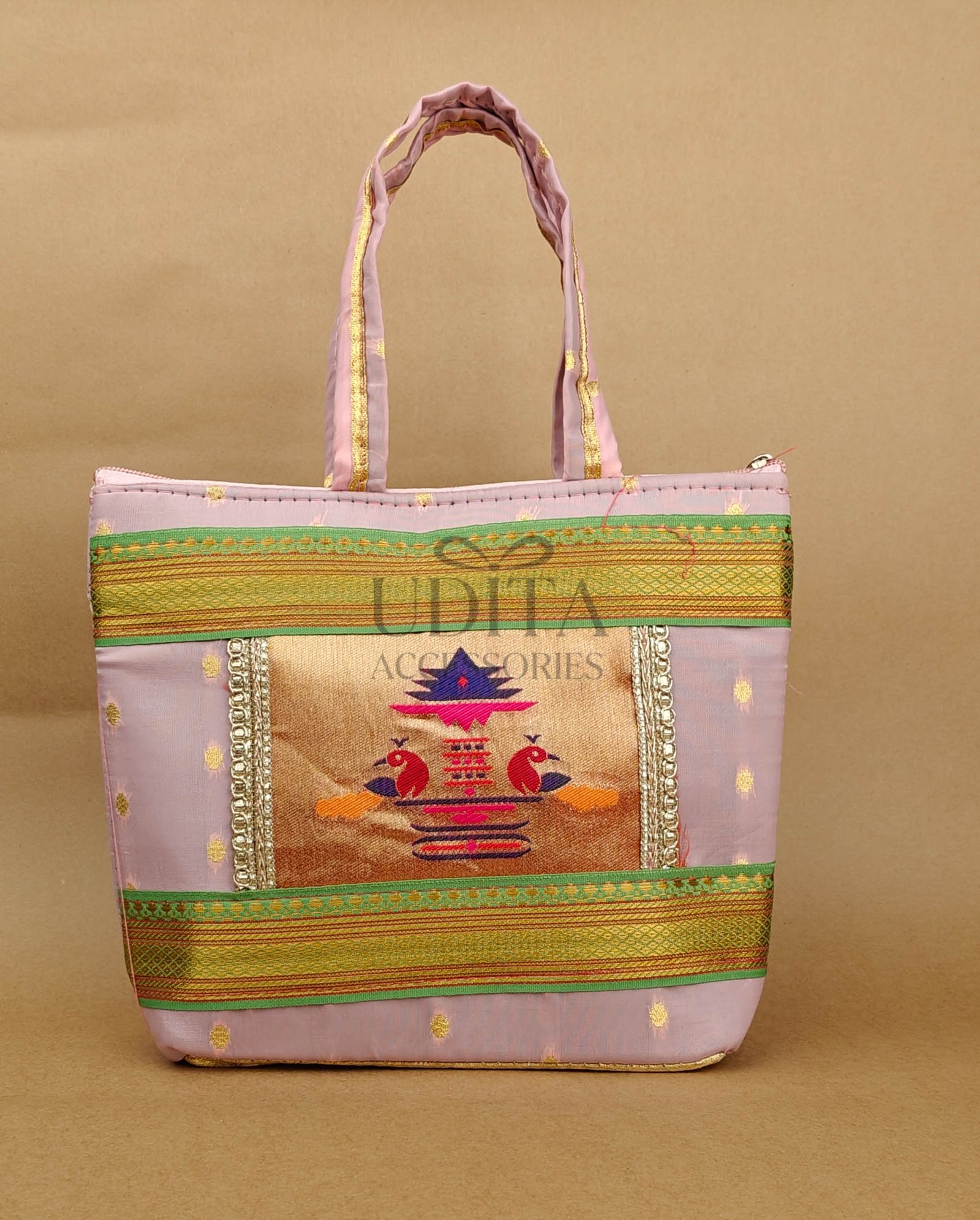 A beautiful handbag featuring traditional Paithani motifs. Ideal for weddings, festivals, and everyday ethnic styling. Spacious and vibrant with premium craftsmanship. Perfect as a gifting choice.
