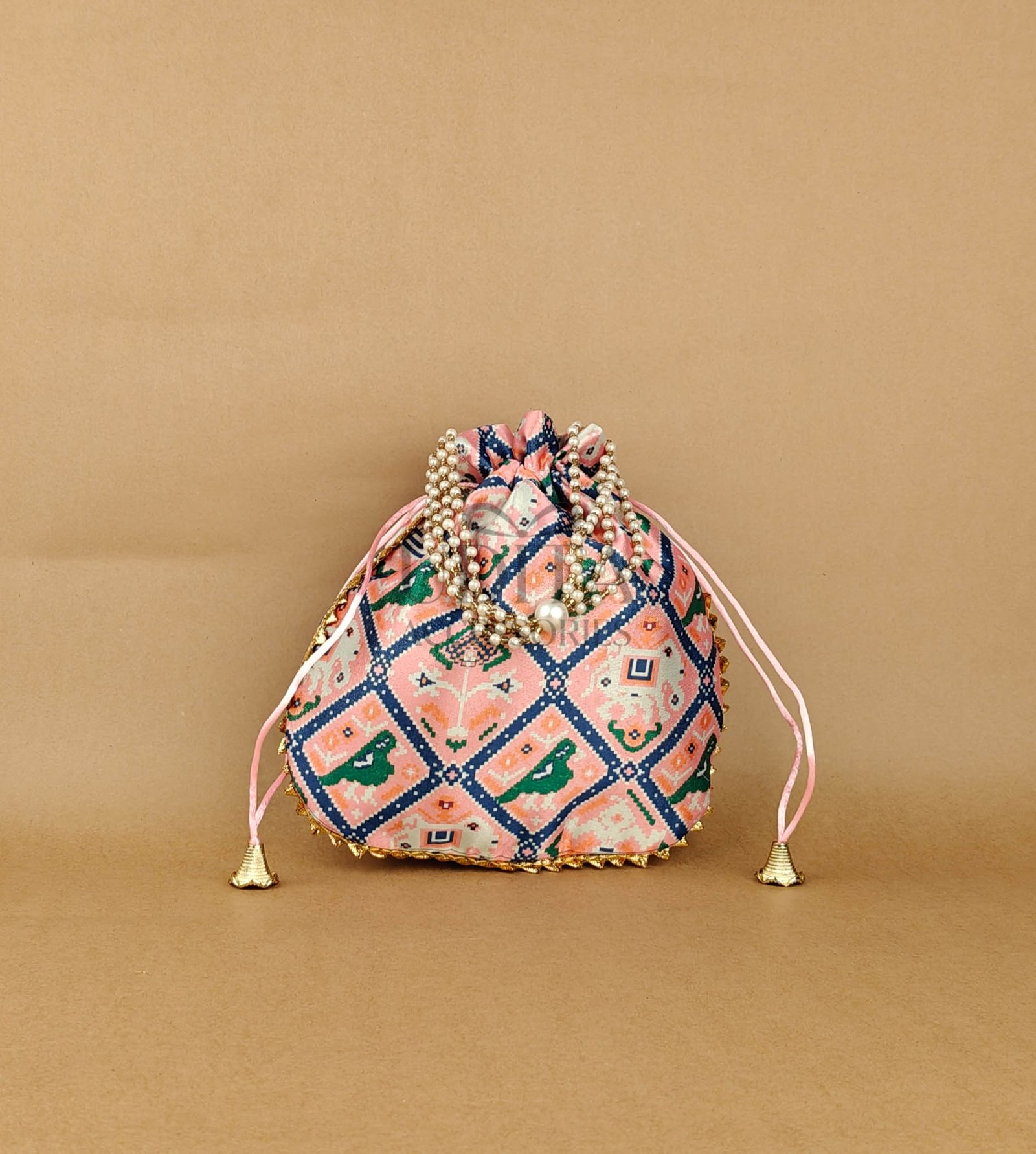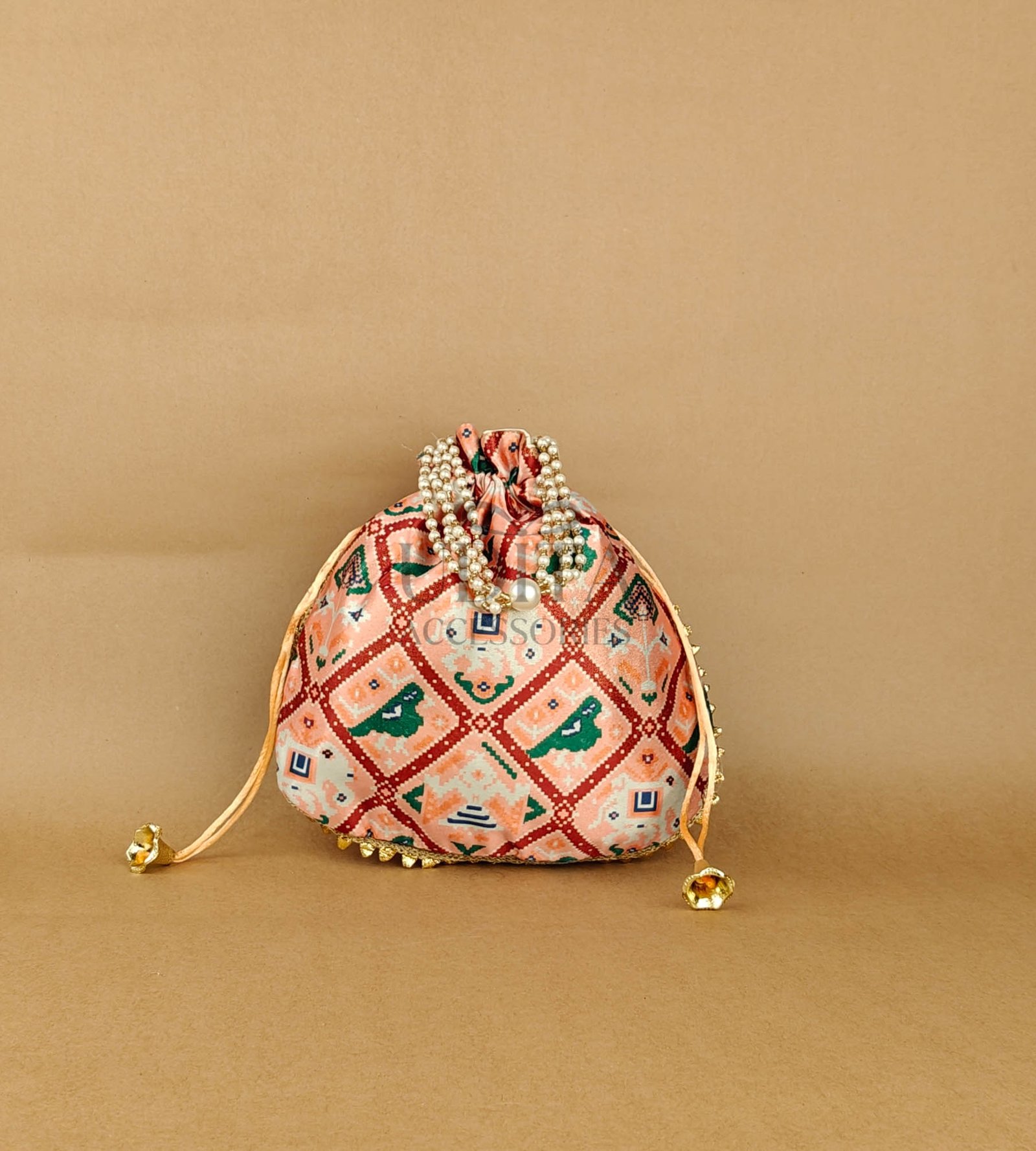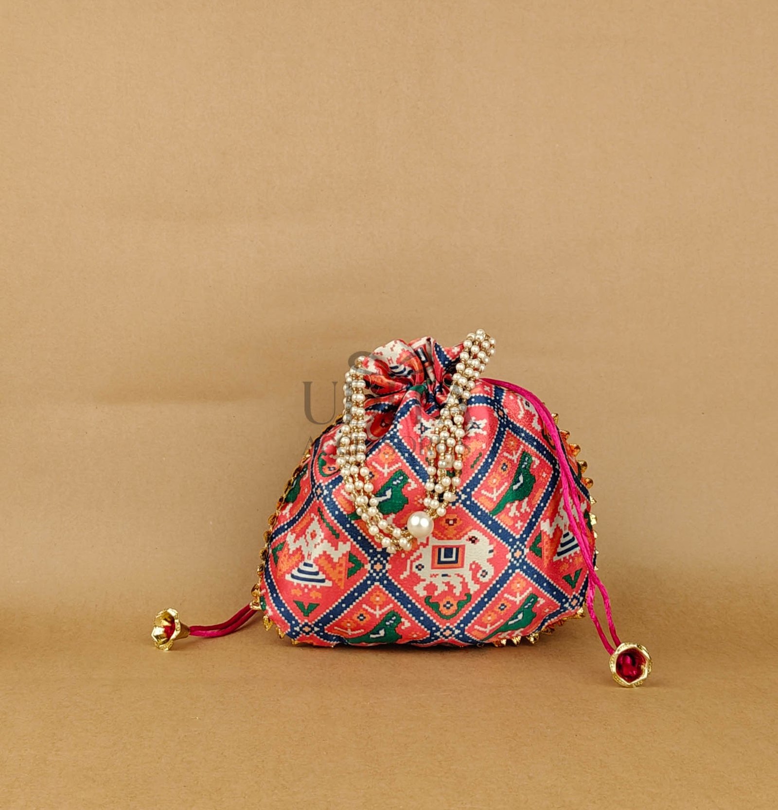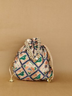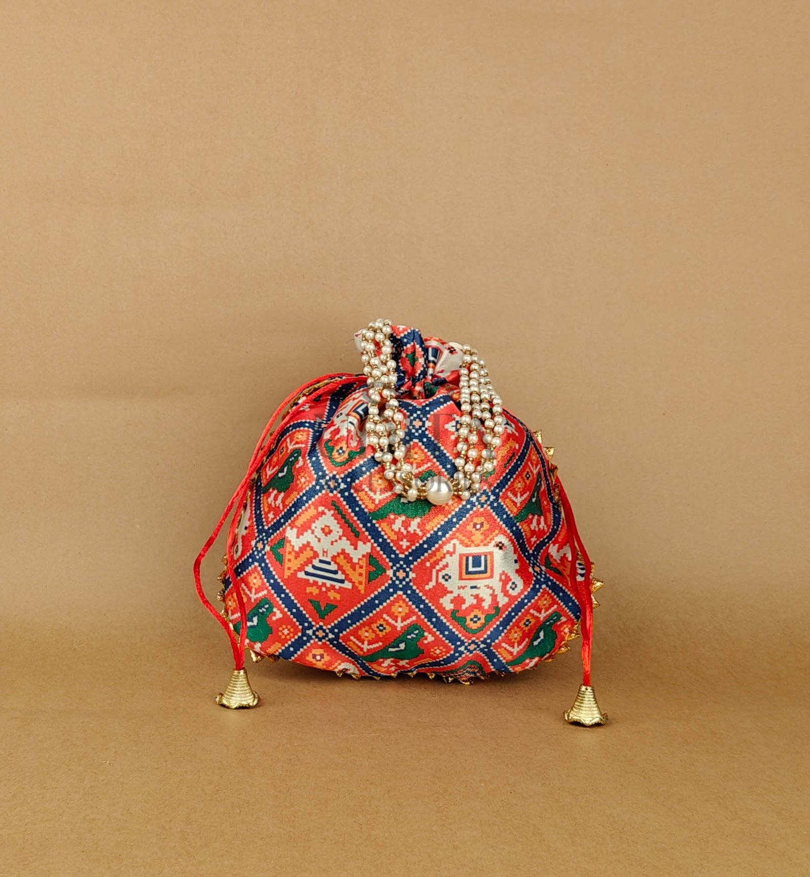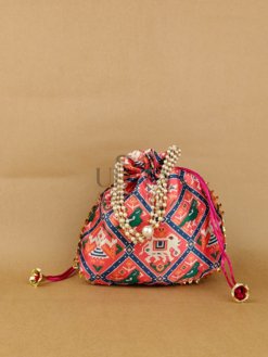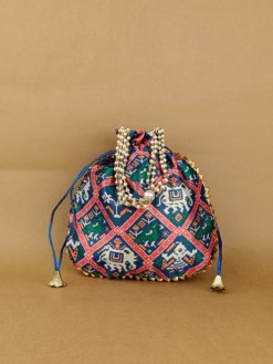 A vibrant potli featuring traditional Patola prints. Spacious and stylish for festive use. Lightweight and easy to carry. Ideal for gifting or party favors.