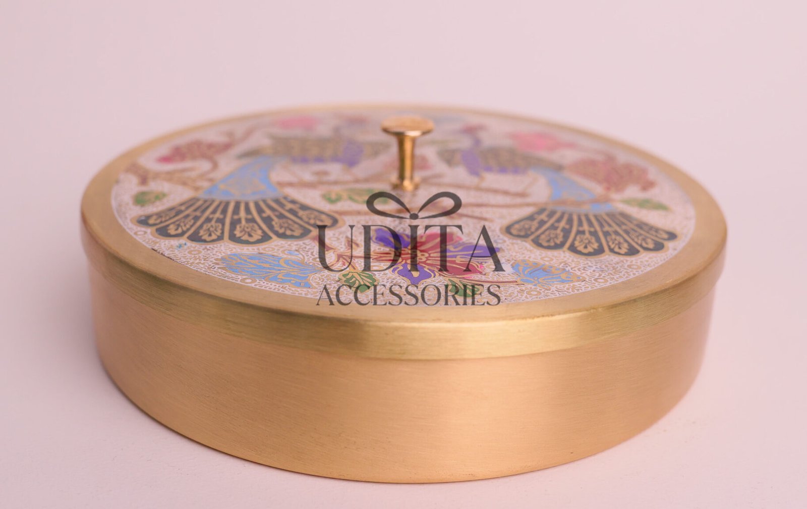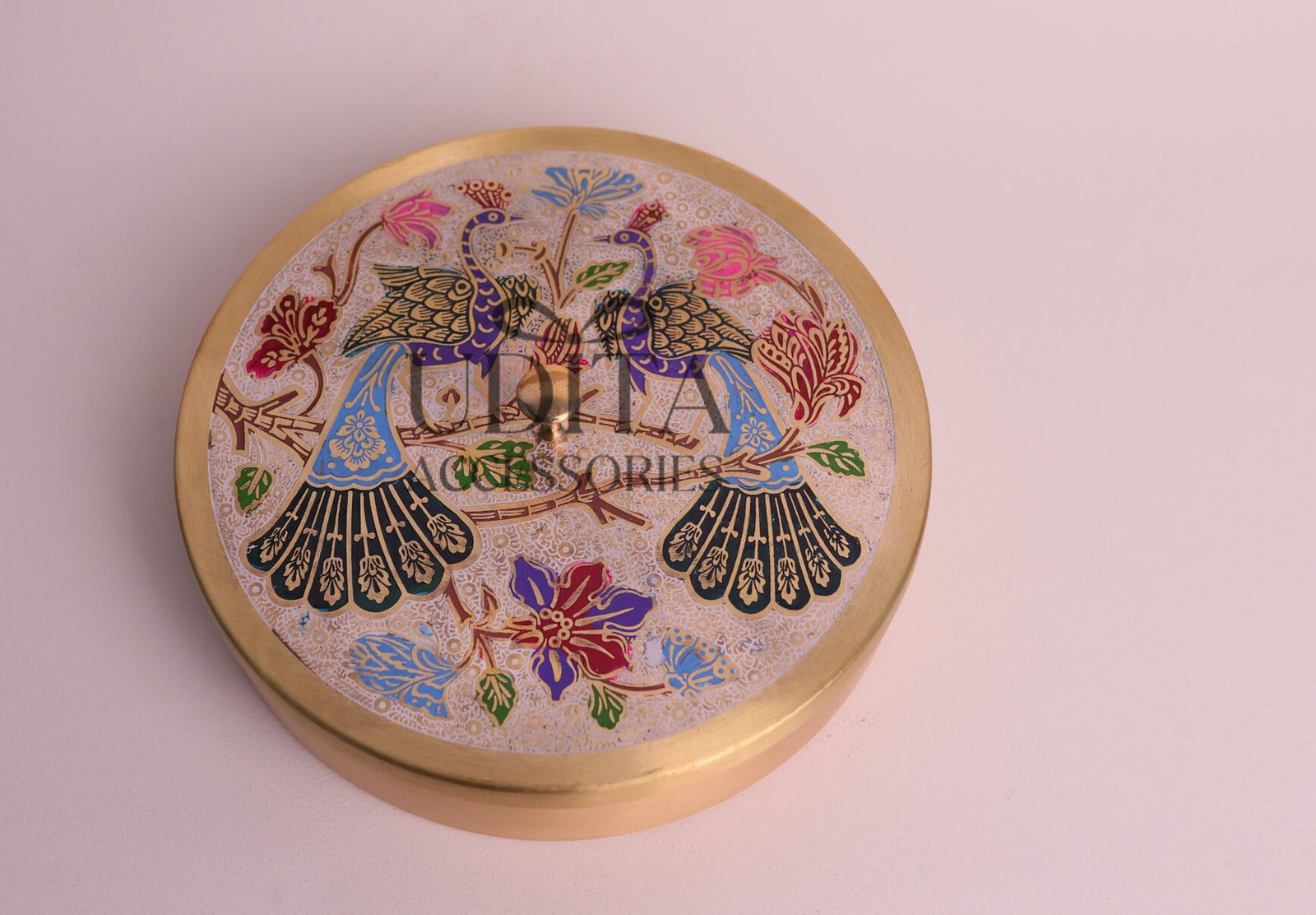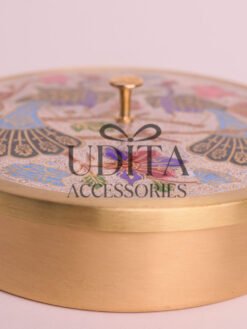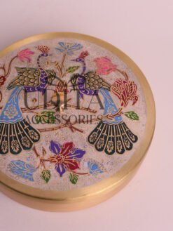 A premium brass masala box featuring a stunning peacock print.