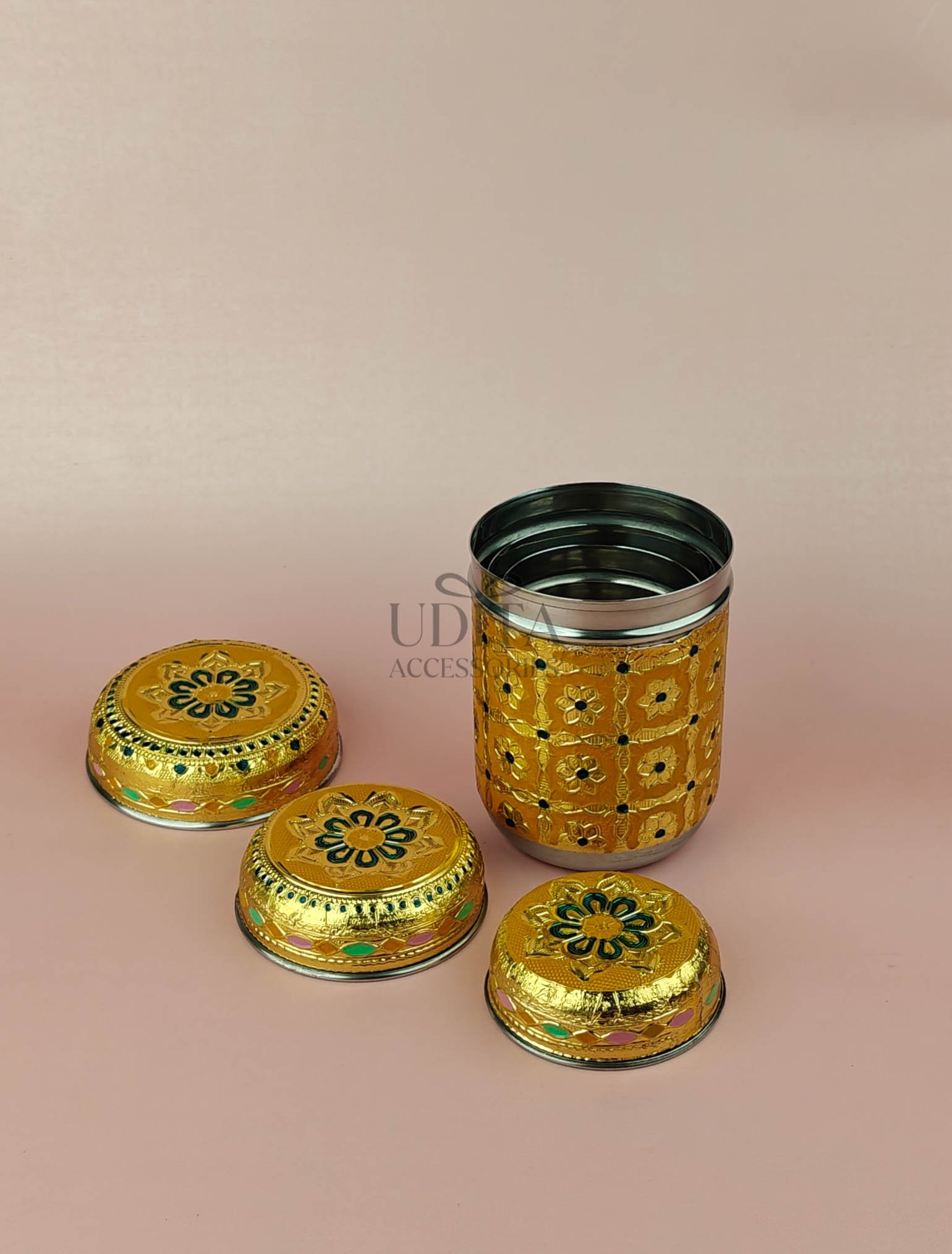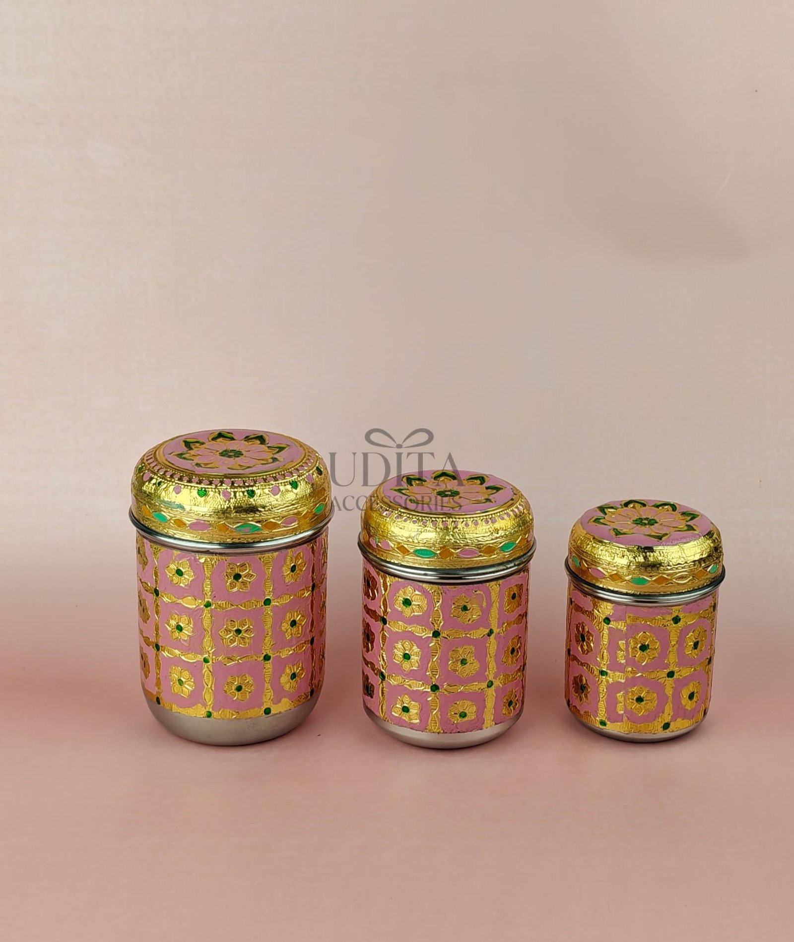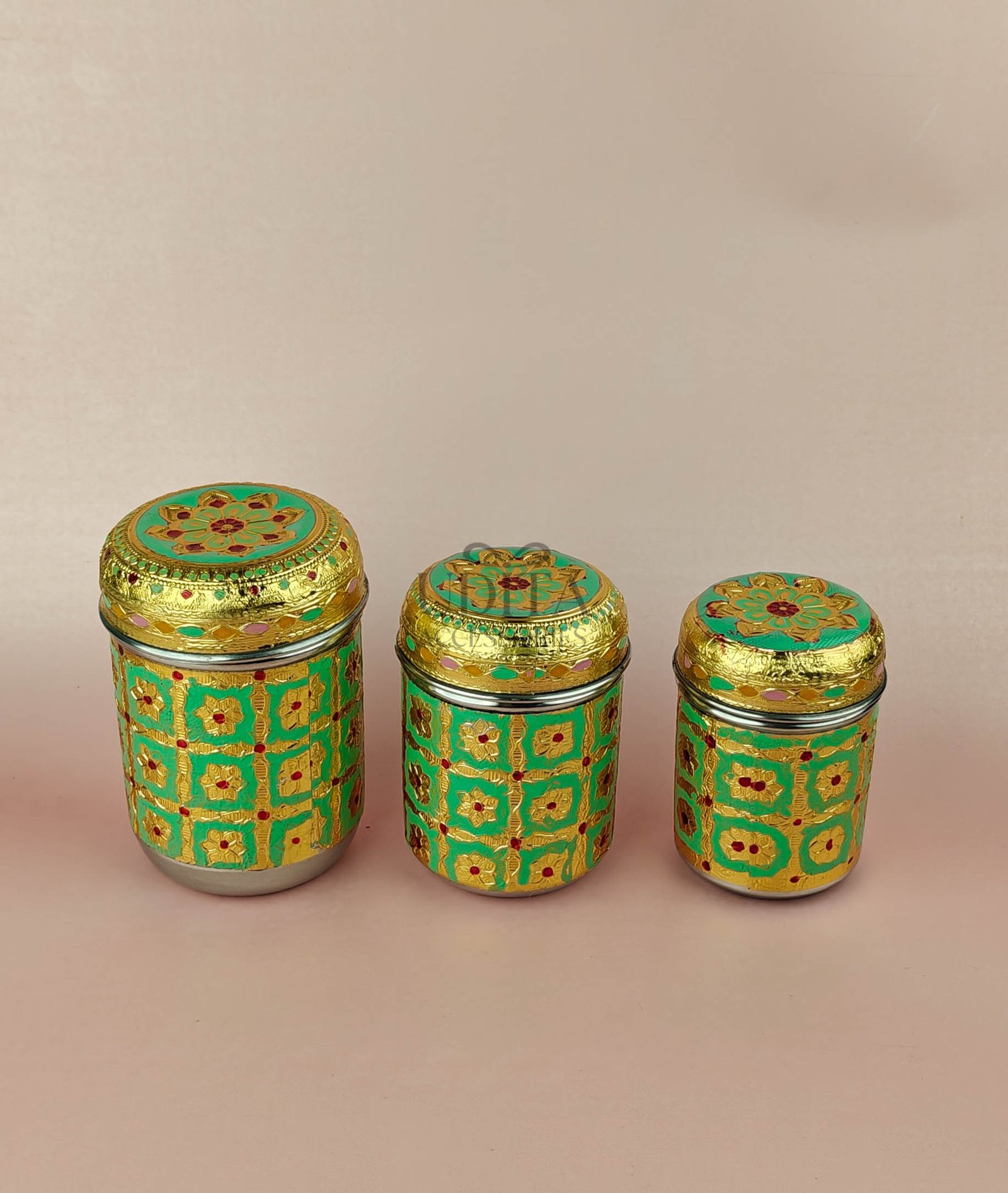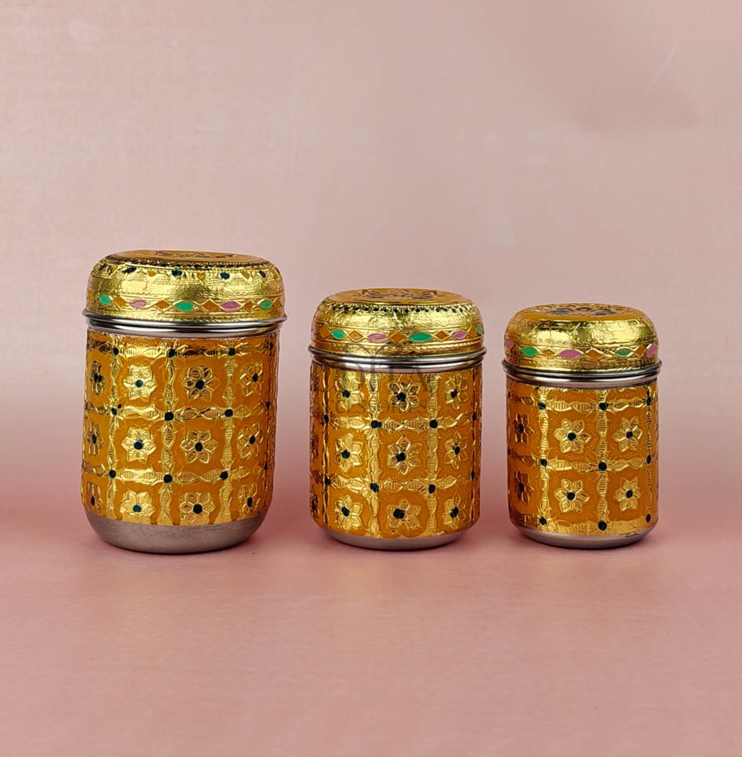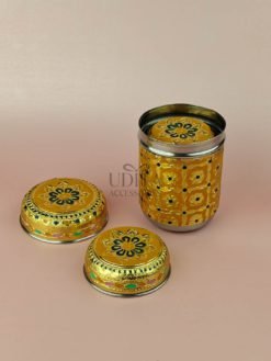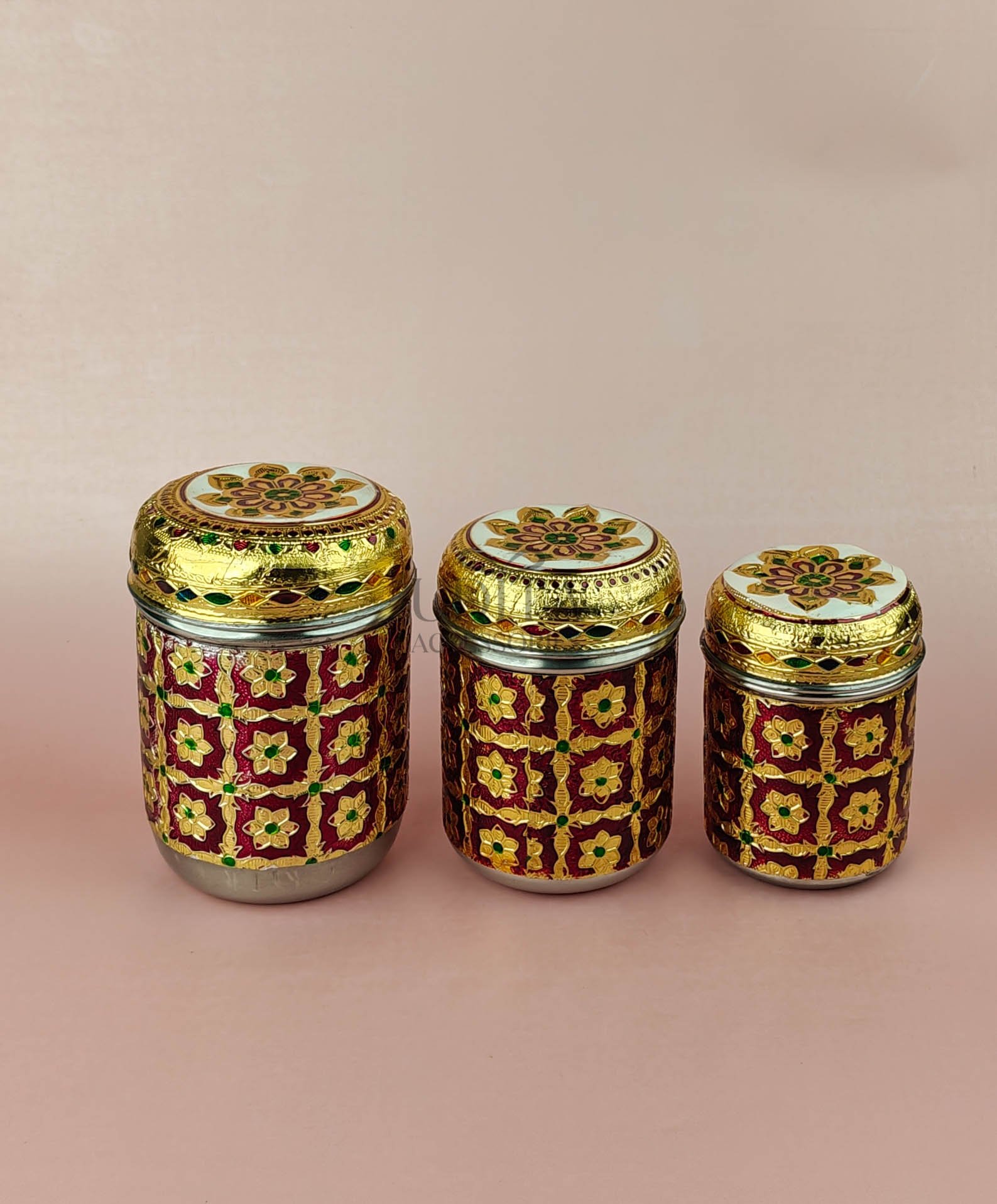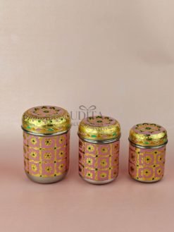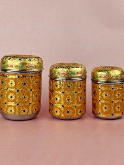 A decorative set of three canisters with vibrant Meenakari work. Ideal for gifting or storing dry items. Rich colors and premium finish add charm. Great for hampers and festive decor.